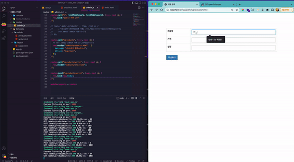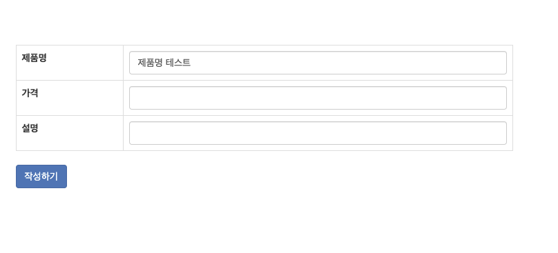 아래 이미지처럼 제품명 테스트라는 문구를 어떤 변수를 받는지 코드를 살펴보면 write.html에서 input 쪽에 name으로 받고있는걸