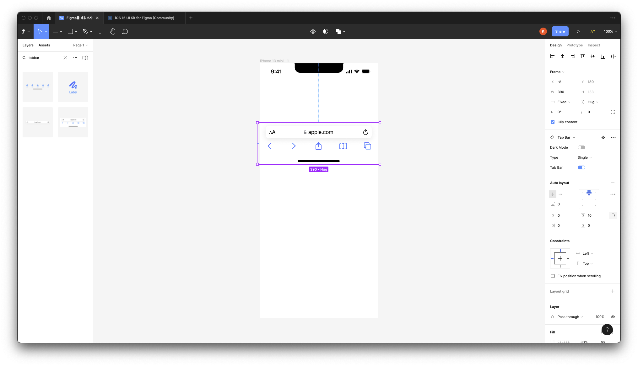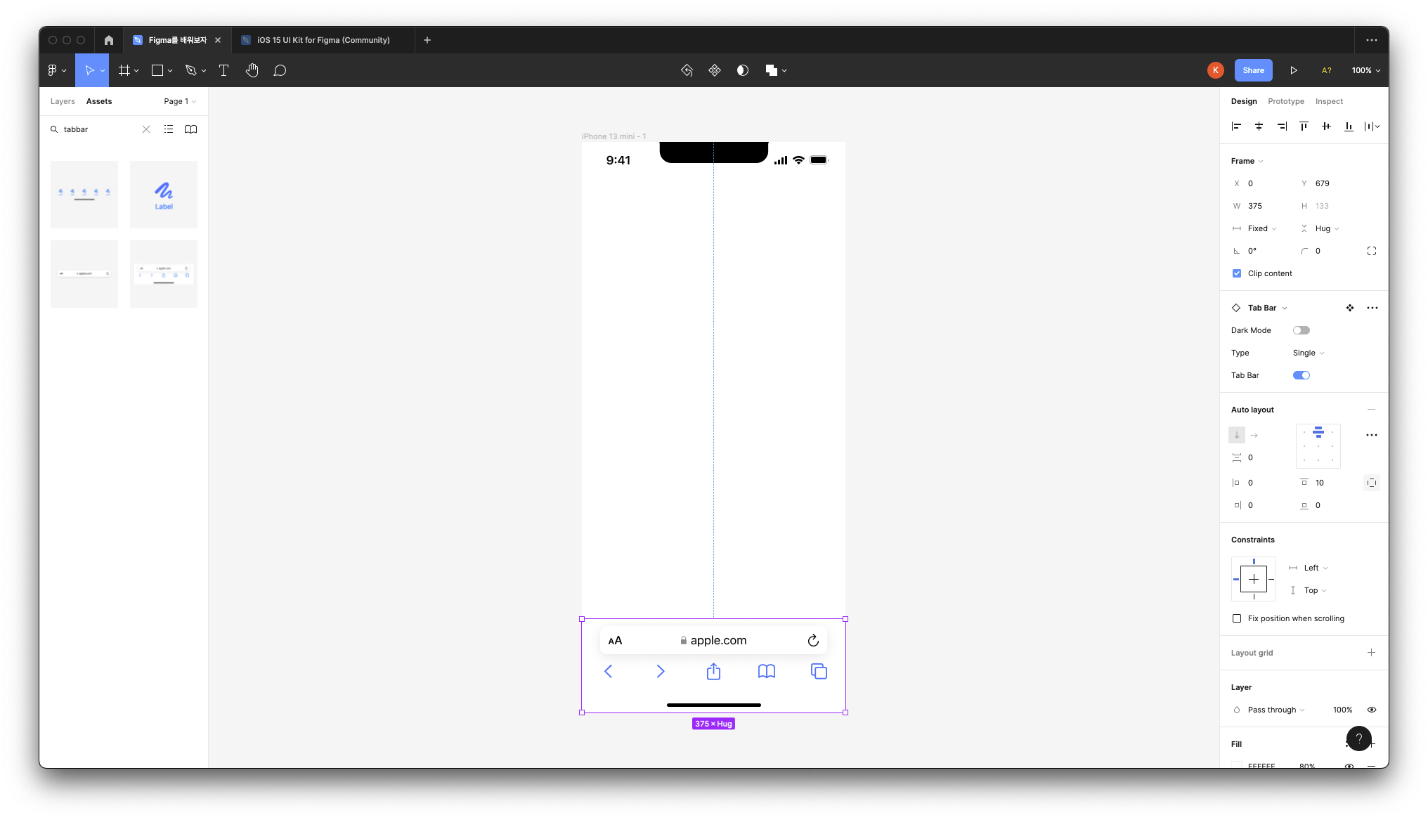 다시 Assets 채널에서 tab bar를 검색하고 프레임 안쪽으로 배치합니다